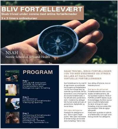 Vi er en del af Danmark Fortæller Kurset er inspireret af vores initiativ Danmark Fortæller, som er virtuelle fortællemøder med danskere i en corona-tid. Vi har udviklet fortællemøderne i samarbejde med Dansk Folkeoplysnings Samråd. Vi samarbejder også med Nationalmuseet og Nørrebro Teater, hvor vi samler corona-fortællinger ind til eftertiden og udvikling af en teaterforestilling med sanger Annika Aakjær.